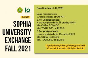 Konnichiwa Unparians! Another good news is here. Sophia University is offering UNPAR students a special opportunity for student exchange at their university. If you are interested, kindly fill in the internal application form at bit.ly/fallprogram2021 by March 19, 2021.